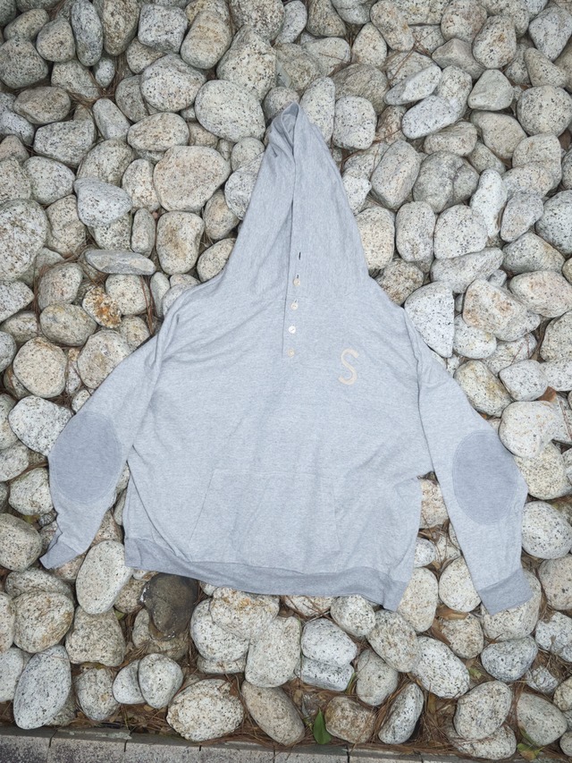 ガーゼのような質感のパーカーです。 薄手の裏毛と定番のワイドなシルエットが特徴のパーカーです。Tシャツ感覚で着れるためオールシーズン活躍するアイテムになります。 エルボーパッチ、胸元にコードエンブロイダリー付き、ボタンはベージュの貝ボタンを使用しています。