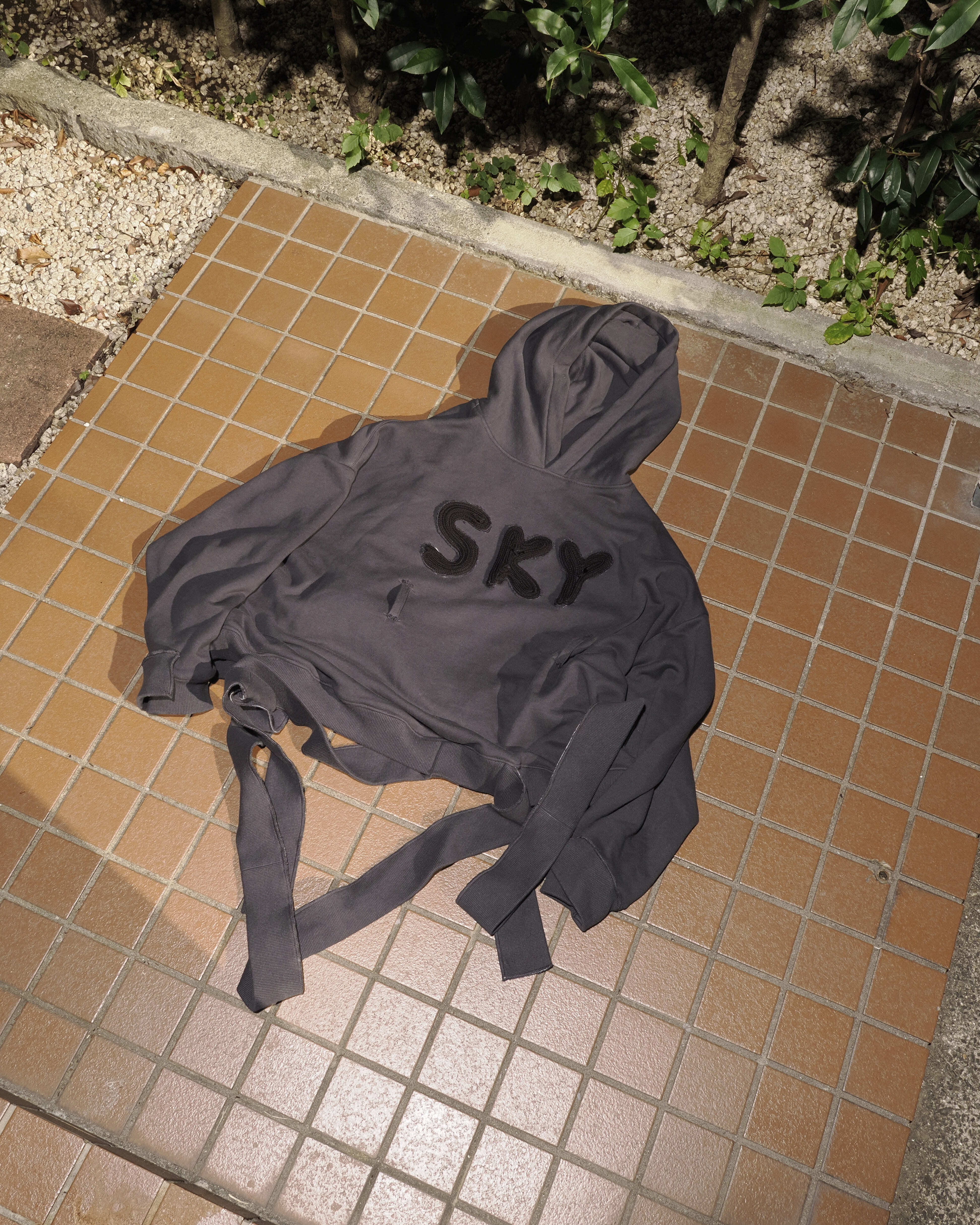 リブがベルトのようにはみ出したパーカー